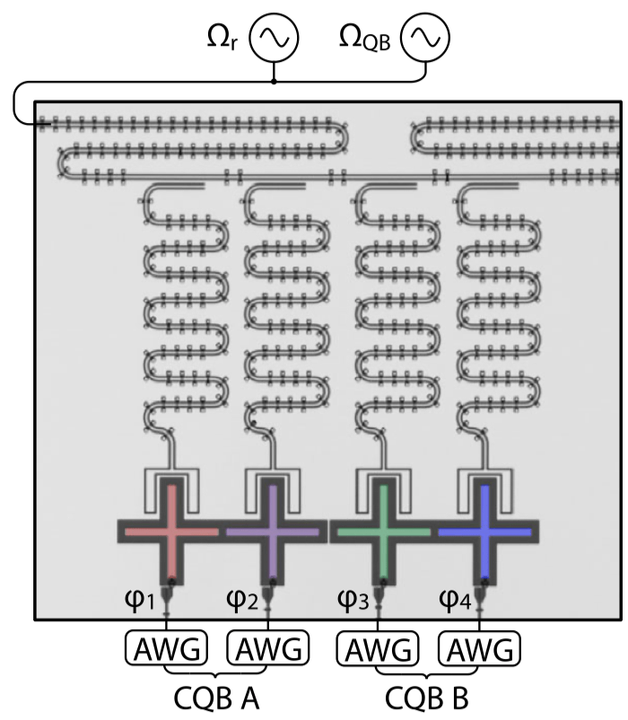 interaction between two composite qubits. This interaction is realized by adiabatically tuning the frequency of the second composite qubit to realize an avoided crossing that evolves the second excited state of the bare transmons – this operation is similar to how a CZ gate is implemented between two standard transmon qubits. The composite qubit state is read out by uniquely mapping the computational states